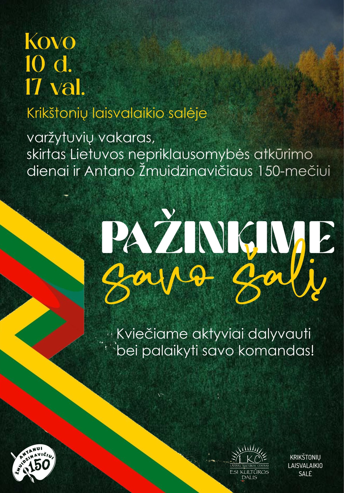 Kovo 10 d. 17 val. Krikštonių laisvalaikio salėje renginių ciklą papildys varžytuvių vakaras, skirtas Lietuvos nepriklausomybės atkūrimo dienai bei Antanas Žmuidzinavičius 150-osioms gimimo metinėms paminėti. Renginio metu dalyviai kviečiami pasitikrinti žinias, prisiminti svarbius istorinius įvykius ir pagerbti iškilią asmenybę bendrystės bei prasmingo vakaro atmosferoje.