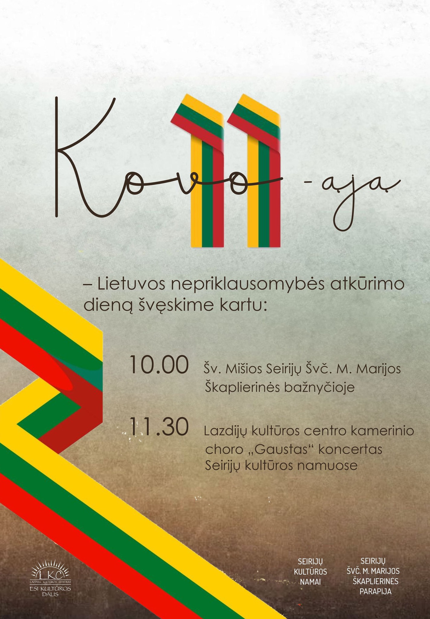 Renginių ciklą, skirtą Lietuvos nepriklausomybės atkūrimo dienai, tęsime Seirijuose: 10.00 val. Šv. Mišios vyks Seirijų Švč. M. Marijos Škaplierinės bažnyčioje, o 11.30 val. Seirijų kultūros namuose koncertuos Lazdijų kultūros centras kamerinis choras „Gaustas“, kviesdamas bendruomenę prasmingai ir iškilmingai paminėti laisvės dieną.
