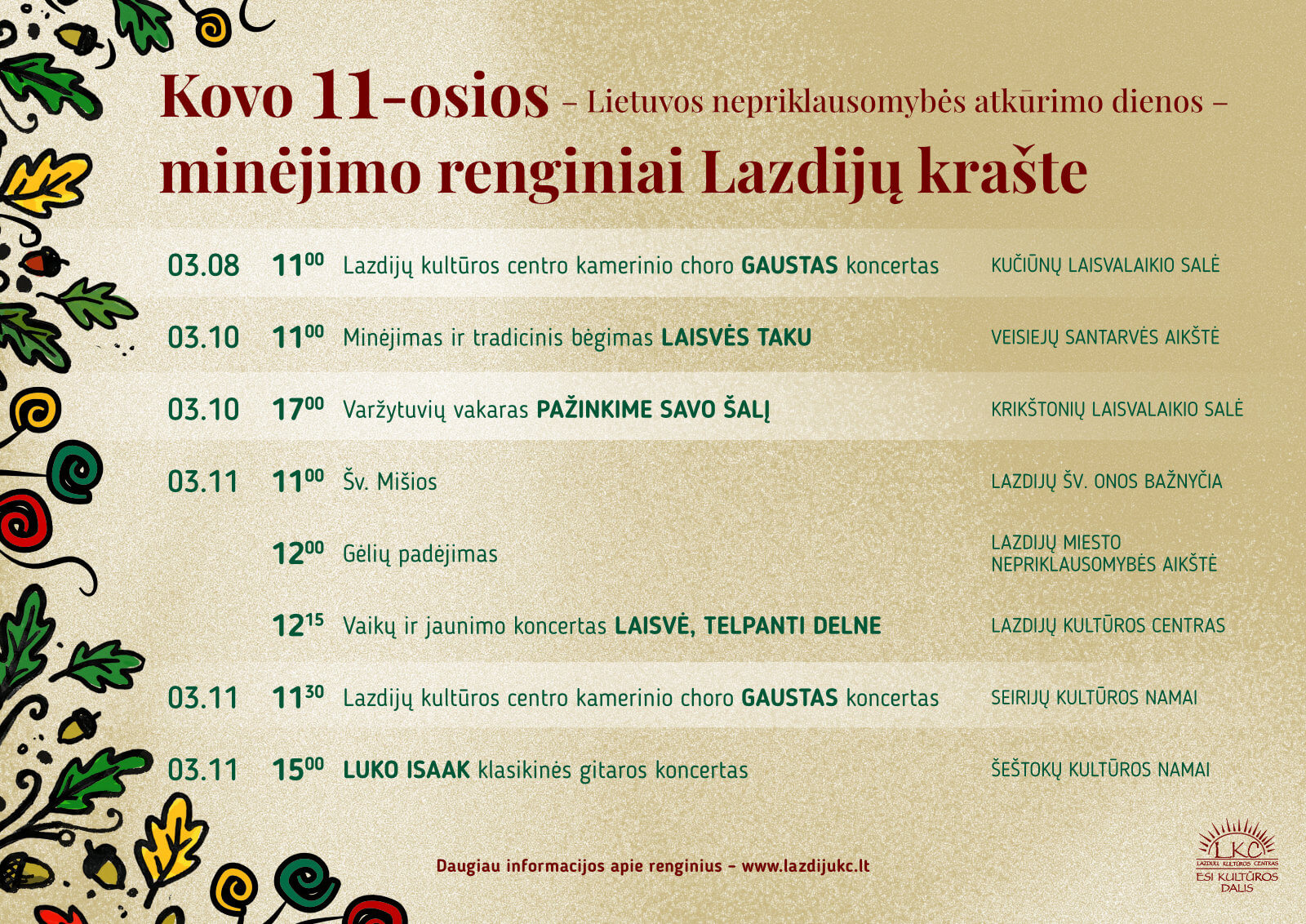 Renginių ciklą pratęs Kovo 11-osios – Lietuvos nepriklausomybės atkūrimo dienos – šventė Lazdijuose: iškilmingas minėjimas prasidės šv. Mišiomis Lazdijų Šv. Onos bažnyčioje, o vėliau šventinę nuotaiką tęs vaikų ir jaunimo koncertas „Laisvė, telpanti delne” Lazdijų kultūros centre, kviesiantis bendruomenę prasmingai ir pakiliai užbaigti laisvės dienai skirtų renginių ciklą.