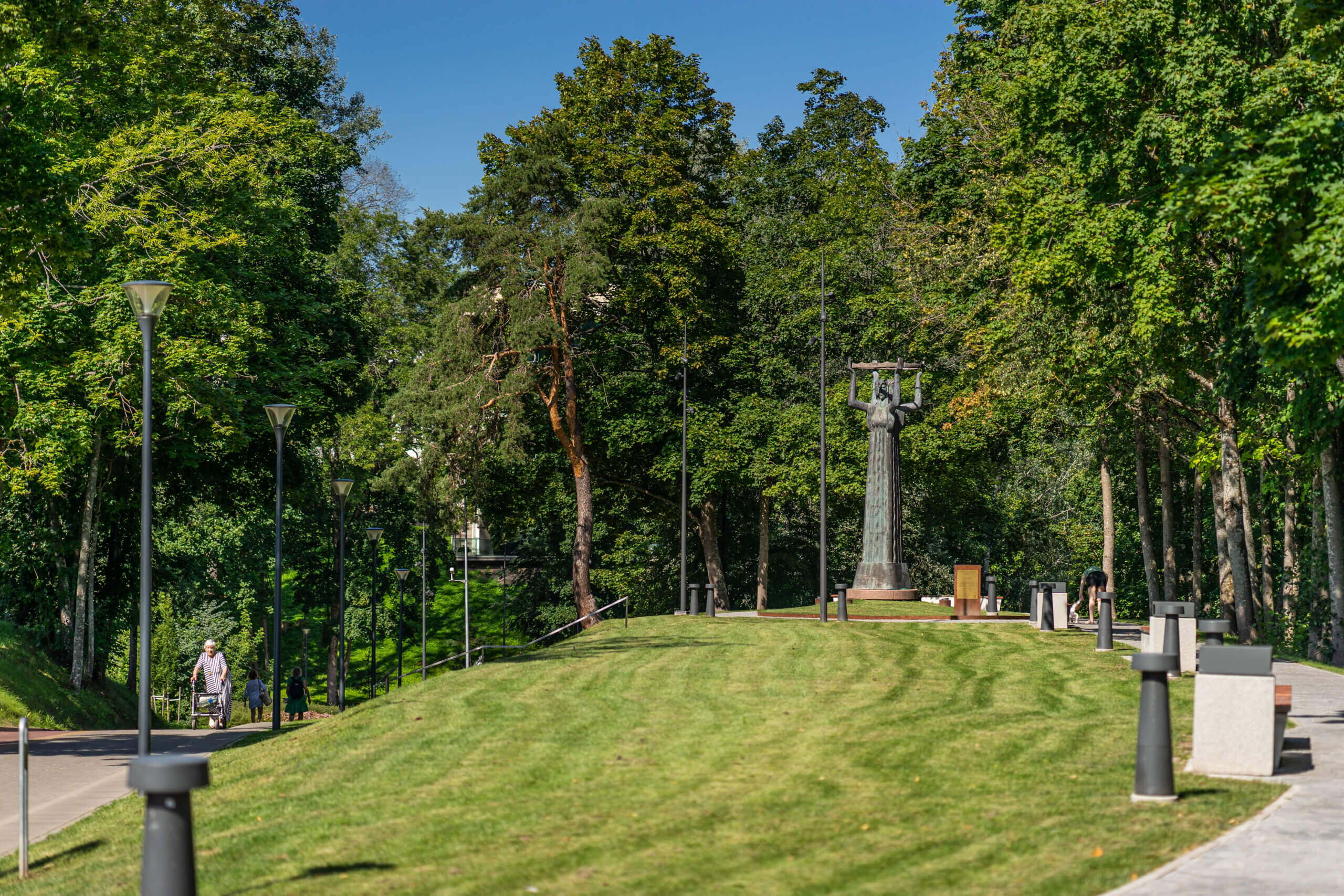Дру́скининкский курган – одно из лучших мест для знакомства с городом. Людям всегда нравилось наблюдать на этом месте за излучиной Нямунаса. Говорят, в межвоенные годы польский маршал Юзеф Пилсудский часами сидел и смотрел на тот берег, где Литва. В XIX веке историки-романтики утверждали, что на этом месте в XIII столетии литовцы построили хорошо укрепленный деревянный замок для защиты от нападений крестоносцев. Это подтверждают записи и артефакты, в 1826 году обнаруженные Теодором Нарбутасом у подножья холма вдоль Нямунаса, а также результаты обследования ближайшего могильника. Сегодня невозможно проверить эти утверждения, так как холм претерпел существенные изменения вследствие наводнения 1841 года. В затопленном городе Дру́скининкай были большие разрушения – мостов, летних домиков. Бурные воды расширили и углубили русло речки Ратничеле, а немалую часть склона замковой горы снесло в Нямунас.
