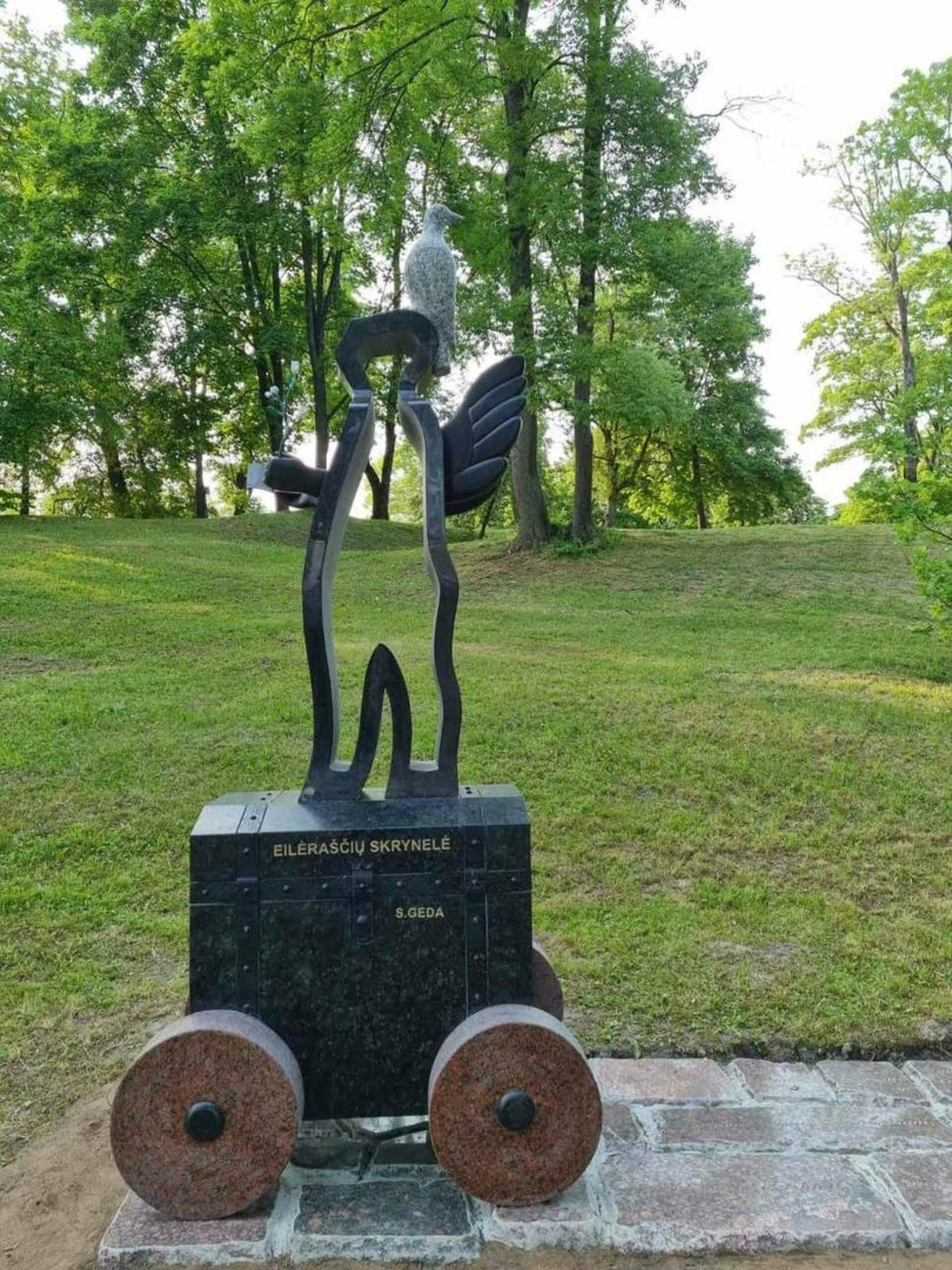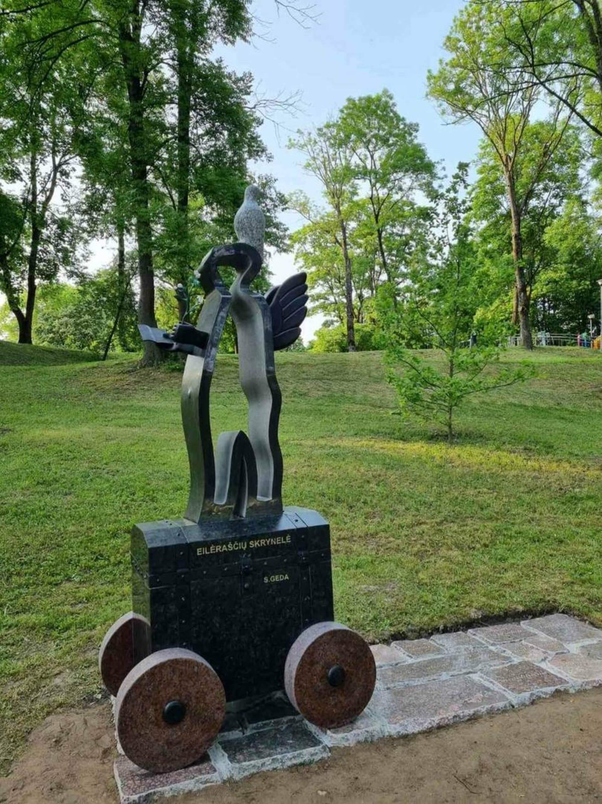 The sculpture was created in the Veisėiai Park within the framework of the project “Making Sigitas Geda’s work meaningful in the Veisėiai region”.