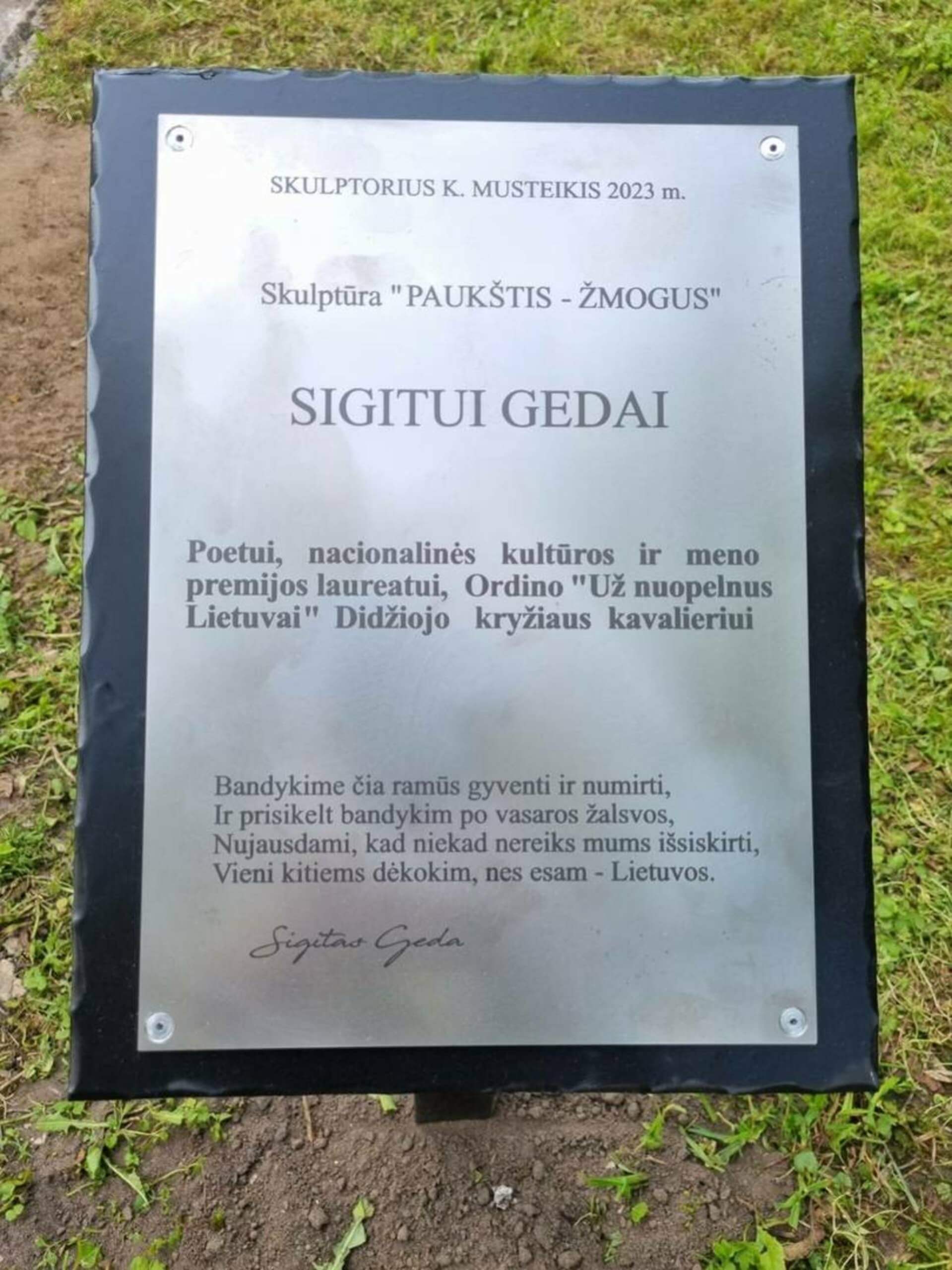 To commemorate the work of Sigitas Geda and to celebrate the 80th anniversary of his birth, a sculpture by K. Musteikis, “Bird – Man”, was erected in his hometown of Veisėiai on 26 May 2023.
