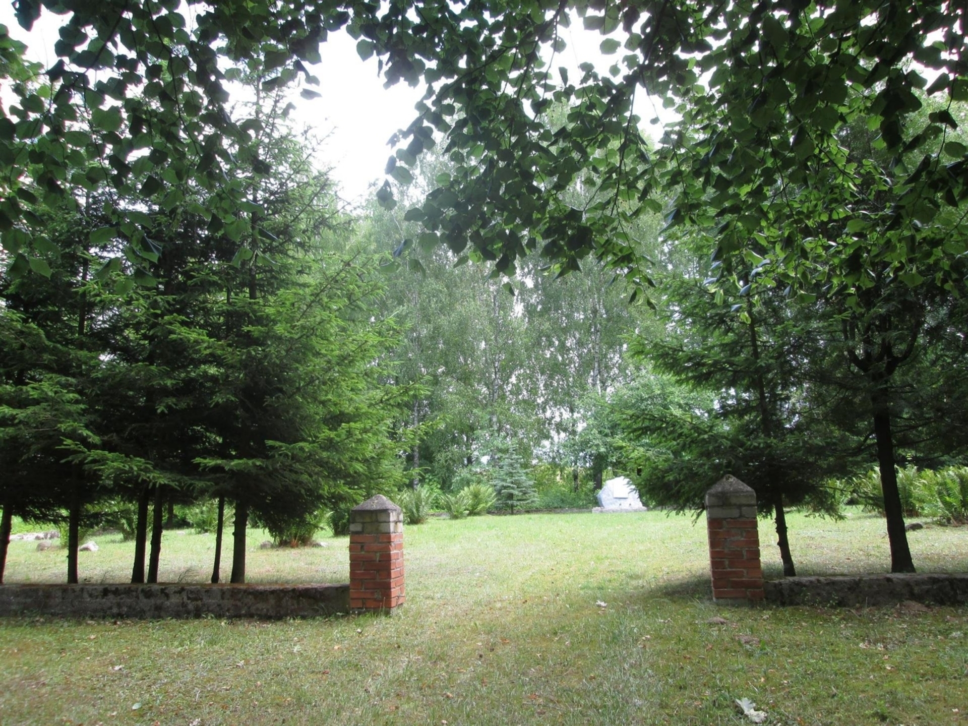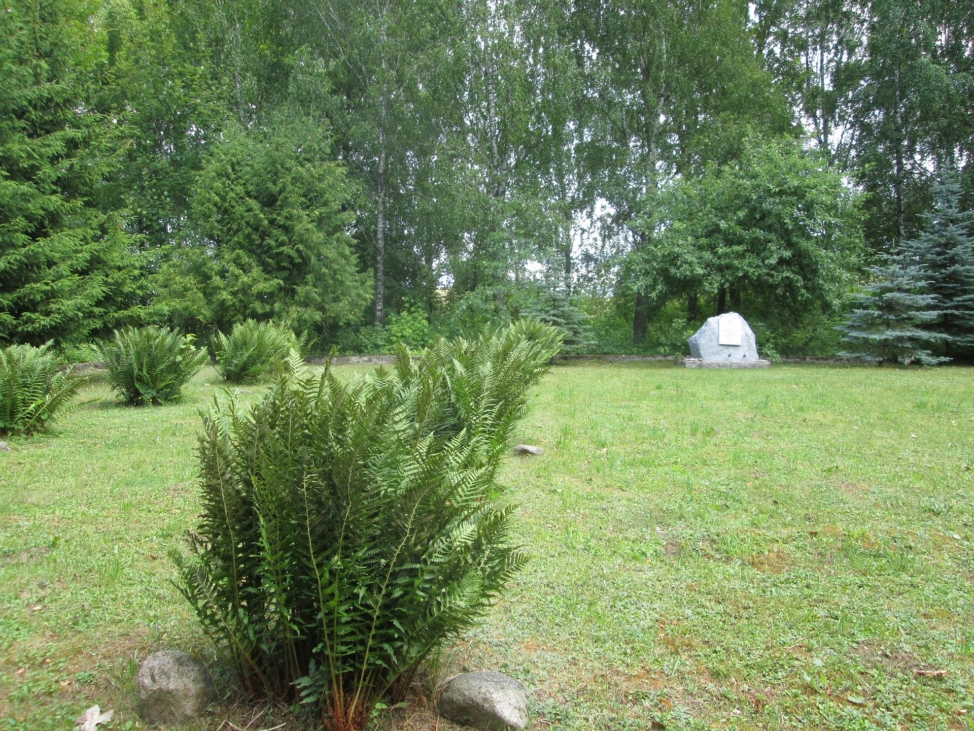 There is a memorial stone in this cemetery with a plaque inscribed with the following inscription: ”IN THIS PLACE / 1941.XI.03. / HITLER’S HENCHMEN / KILLED 1535 / LAZDIJAI DISTRICT / RESIDENTS / JEWS / MEN / HUSBANDS, WOMEN, CHILDREN” (the monument has been renewed in 2015, the stone has been painted, and the plaque has been changed). The cemetery is surrounded by concrete fence foundations, two brick columns at the entrance, single spruce trees and thuja trees grow on the edges of the territory, there are several stones without inscriptions.